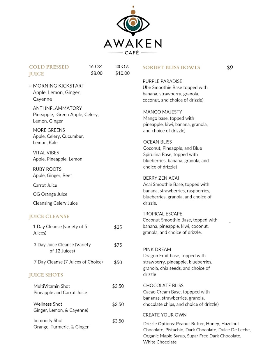 But the indulgence doesn't stop with the coffee—Awaken Cafe is also well-known for its Sorbet Bliss Bowls, perfect for those seeking a fresh and fruity experience. The Purple Paradise bowl with a base of ube sorbet topped with banana and coconut is a strikingly colorful delight, while the Mango Majesty bowl delivers a tropical explosion with its vibrant flavors of pineapple and kiwi. Both bowls are beautifully presented and are sure to bring a smile with every refreshing spoonful.